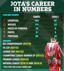 Illustration of Diogo Jota’s career statistics, including games played and goals scored for various clubs and the national team.