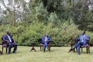 Photos shared online on Friday evening showed Raila, Ruto, and Prime Cabinet Secretary Musalia Mudavadi in a cordial and seemingly strategic conversation, prompting speculation about the direction of Kenya’s political alliances ahead of the 2027 elections.