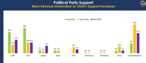 The data shows ODM’s support jumped from 13% in September to 20% in November, signaling renewed momentum. UDA held steady at 16%, while Jubilee recorded a sharp rebound from 3% to 11%. In contrast, DCP slipped from 9% to 6%, suggesting waning traction.