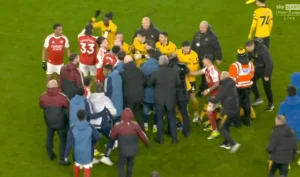 Gabriel Jesus confronted Wolves defender Yerson Mosquera, shoving him and triggering a mass scuffle involving players and staff from both sides.